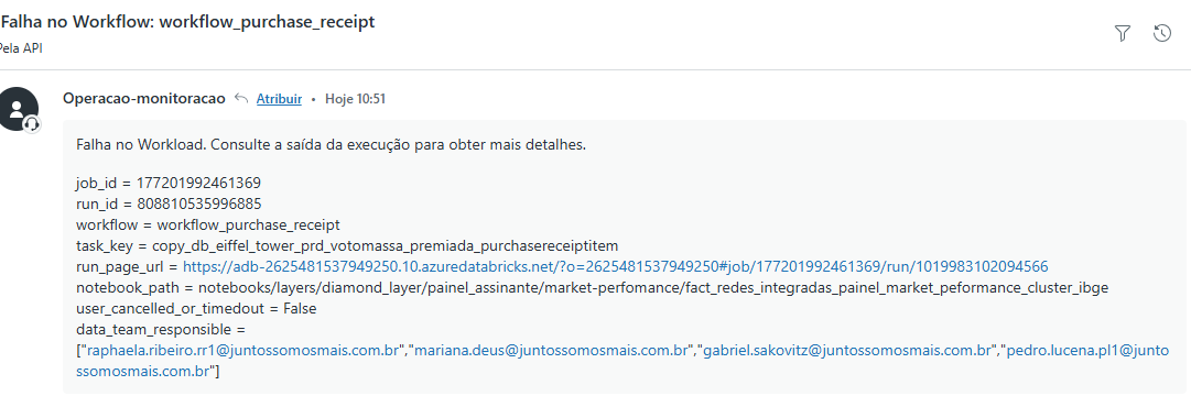 São alerta de quando um workflow do Databricks falha por algum motivo e gera um thread Slack e um chamado no Zendesk.